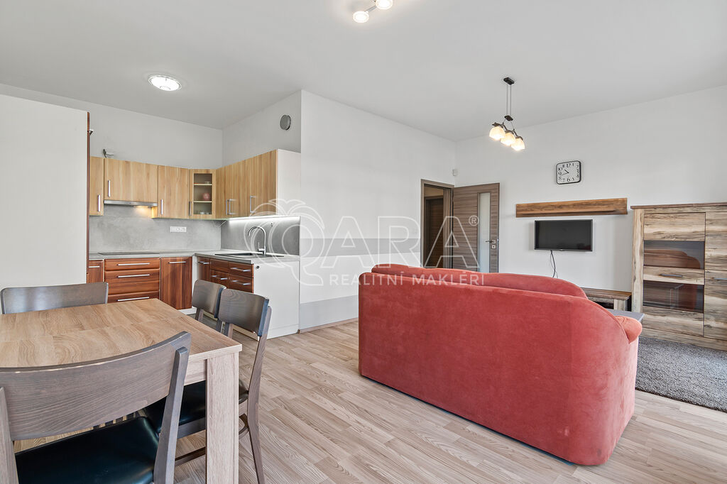 Představte si byt 2+kk o celkové ploše 59 m2, který se nachází v přízemí (1. nadzemním podlaží) cihlového domu v Pitkovických zahradách. Hned vás zaujme moderní kuchyňská linka s vestavěnými spotřebiči – lednicí, troubou, varnou deskou, digestoří, mikrovlnnou troubou a myčkou. Je prakticky umístěná ve výklenku obývacího pokoje, takže budete mít všechno po ruce.