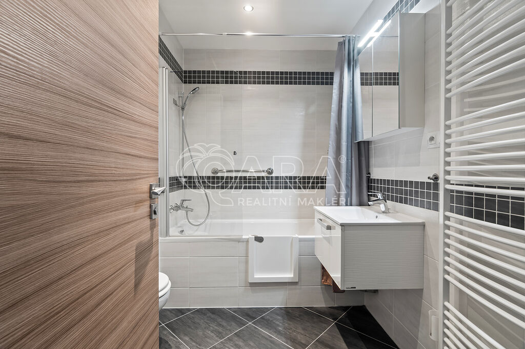 Co je na tomto bytě opravdu skvělé, je přímý vstup z obou pokojů na zpevněnou terasu (27 m2) a k tomu na vlastní předzahrádku (+ dalších 36 m2). Tam si můžete v klidu vypít kávu, posedět s přáteli nebo si třeba něco ugrilovat. Koupelna je vybavena vanou se sprchovou zástěnou, toaletou, žebříkovým radiátorem a pračkou. Oceníte také praktickou komoru s regály uvnitř bytu, která vám poskytne spoustu úložného prostoru.