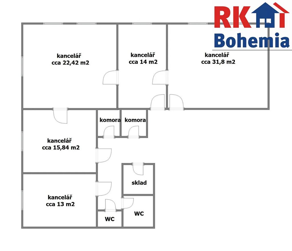 Jedná se o 5 kanceláří se sociálním zázemím a s komorami, nacházející se v přízemí budovy.