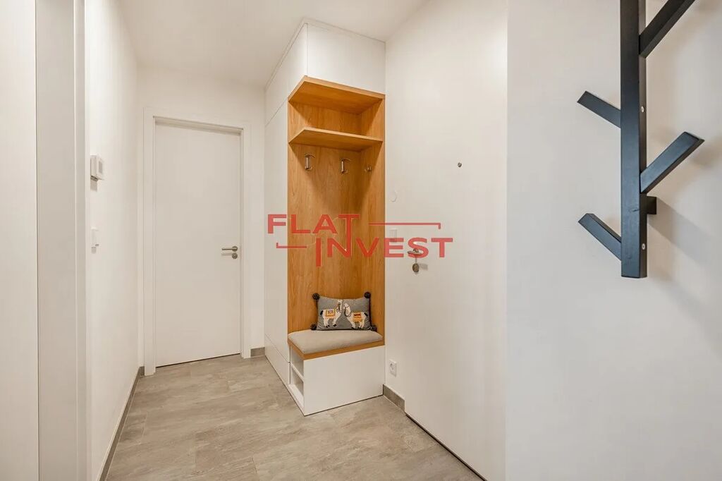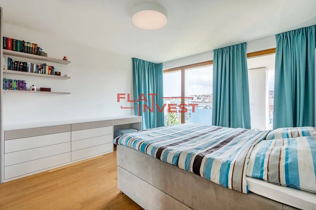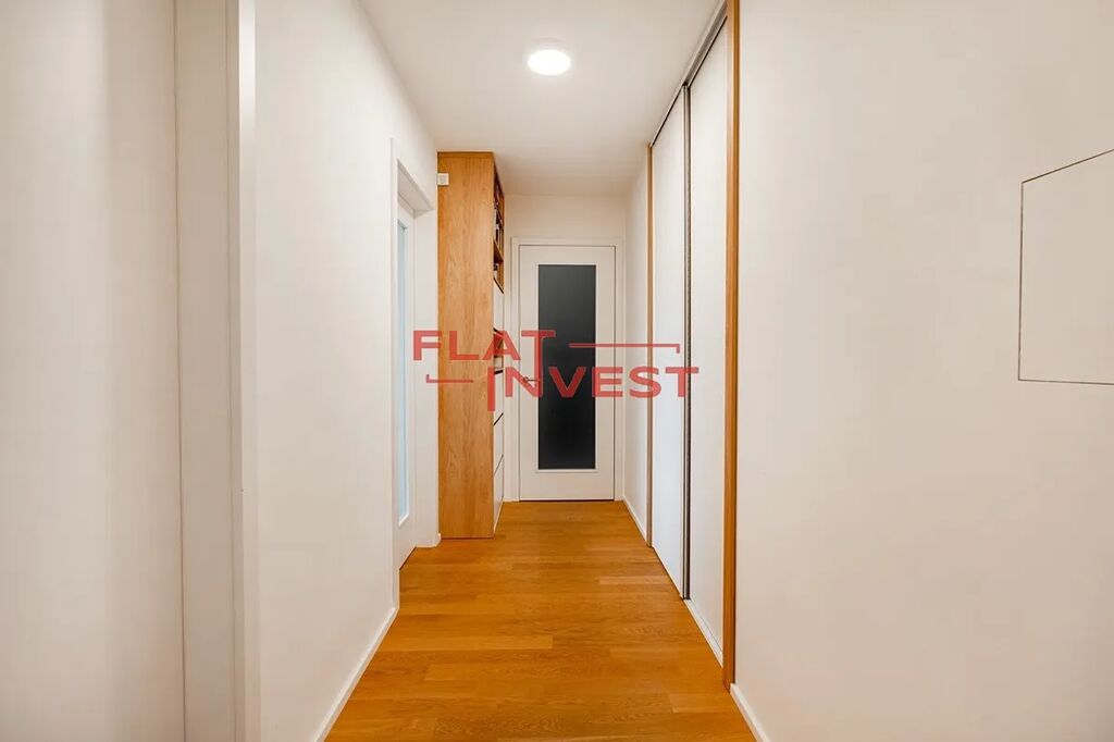 Byt zdobí kvalitní dřevěné podlahy a velkoformátová okna, která zajišťují spoustu světla i krásné výhledy. Hlavní ložnice nabízí boxspringovou postel a velkou vestavěnou skříň, útulný dětský pokoj je vkusně zařízen a prostorná vstupní chodba přidává další úložné prvky (vestavěná skříň + knihovna).