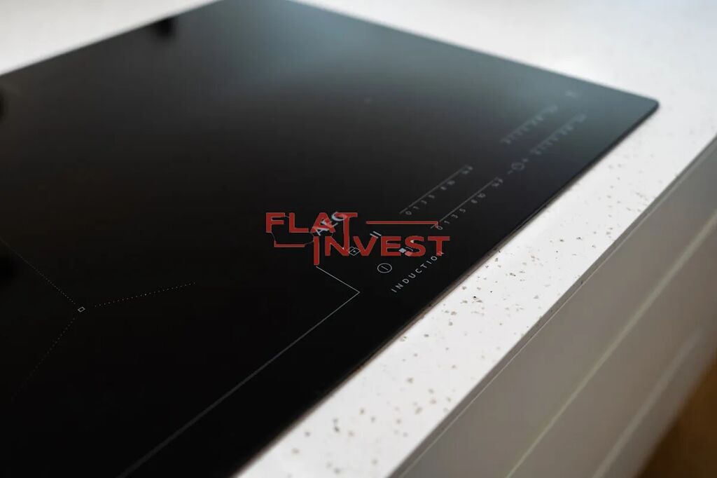 Kuchyň na míru: lednice + samostatný mrazák, myčka, indukce, trouba, MW, kávovar, vinotéka, ohřev talířů, designová digestoř