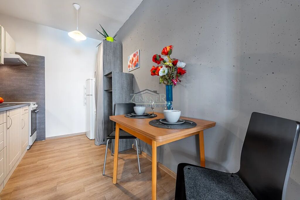 Byt je téměř plně vybavený – kuchyňská linka s elektrickým sporákem a digestoří, chladničkou, jídelní stůl s židlemi, obývací stěna, šatní skříně, manželská postel a noční stolky.