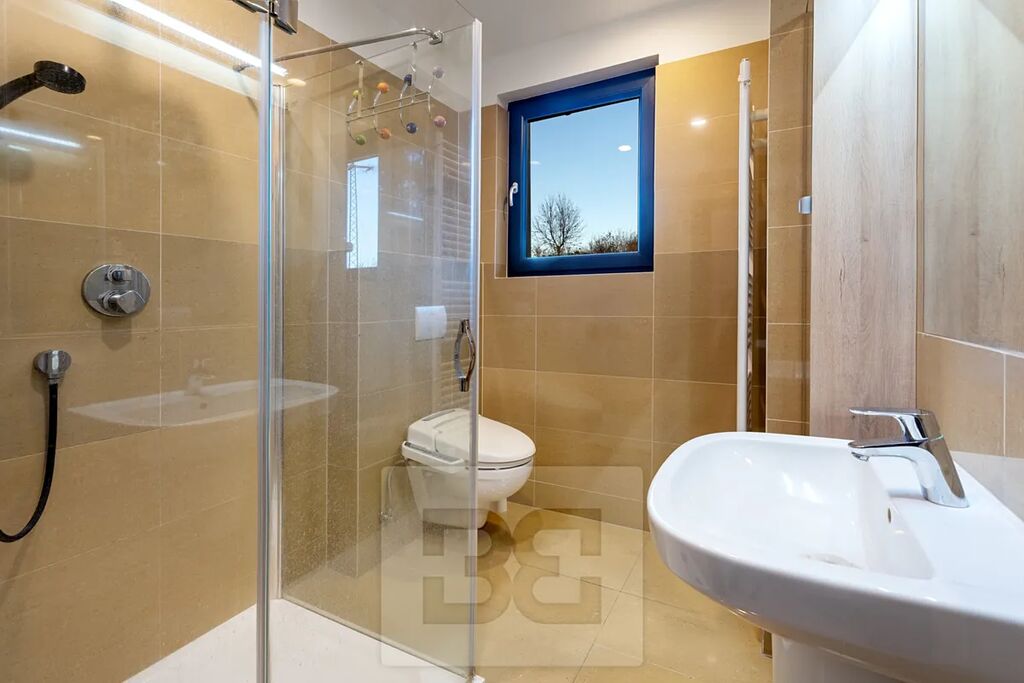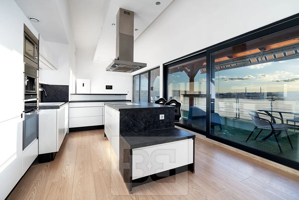 První patro má dispozici dispozici 3kk o celkové výměře 102m² a dominuje mu terasa o celkové velikosti 22m² a francouzským oknem po celé délce a šířce stěny, díky kterému si užijete opravdu překrásný výhled i z kuchyně, jídelny či obývacího pokoje. Ve středu kuchyně je ostrůvek s barovými židlemi a sklokeramickou deskou značky baumatic, kde za zády je prakticky umístěna vestavěná trouba stejné značky. Dále v prvním patře najdete ložnici s vlastní koupelnou se sprchovým koutem a toaletou a soukromou šatnou, hlavní koupelnu s vanou a druhým pokojem, ke kterému také patří vlastní šatna. Podél celé chodny jsou vestavěné skříně, které poskytují dostatek úložného prostoru.