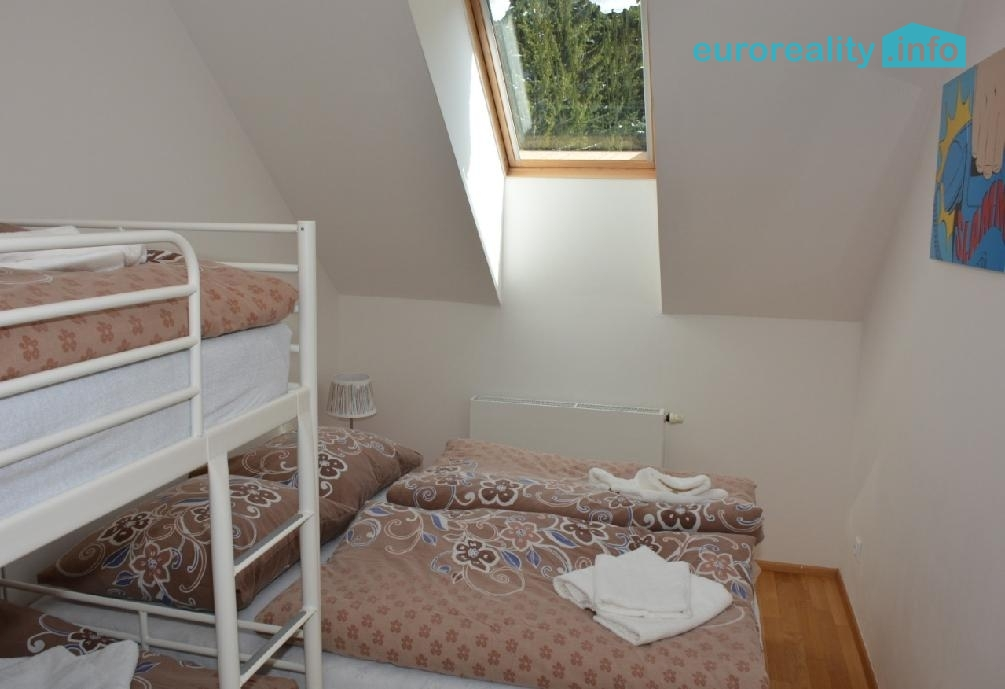 Apartmán je mezonetový, podkrovní, situovaný v posledních dvou patrech apartmánového domu Javor.
