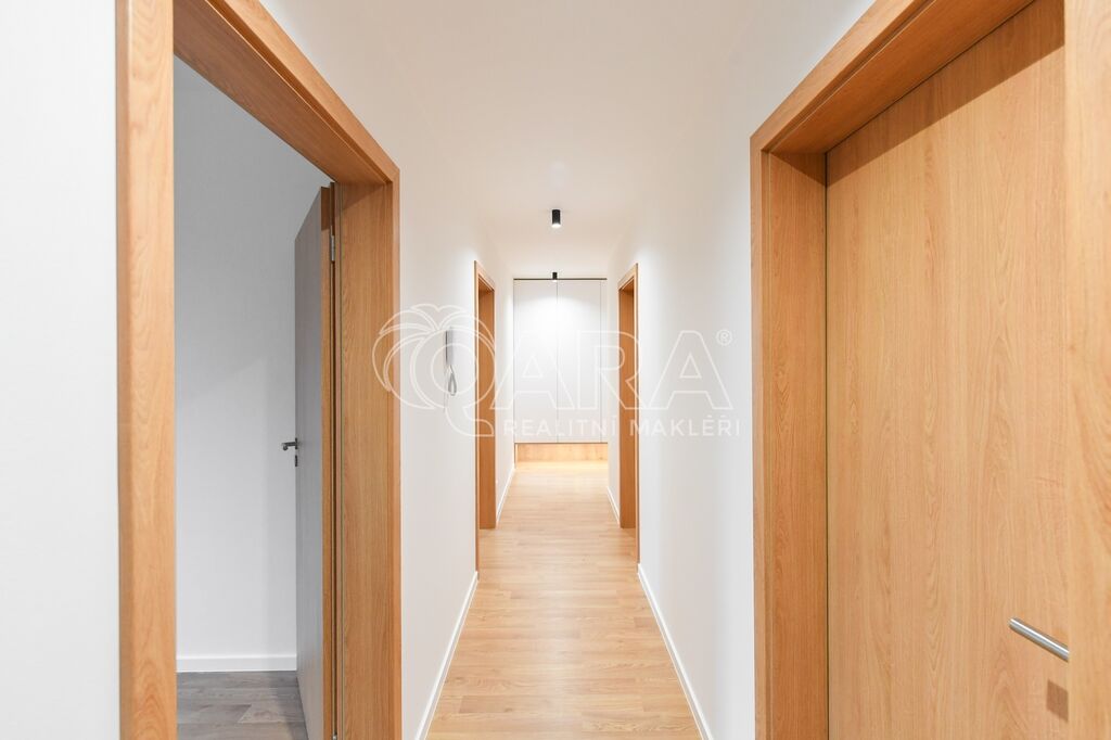 Byt o celkové výměře 64,2 m² (vnitřní plocha – 59,3 m², balkon – 2,6 m²) je velice dobře dispozičně řešen a tvoří jej: obývací pokoj s kuchyňským koutem, 2x ložnice, prostorná vstupní chodba, koupelna se sprchovým koutem a samostatné WC. Obývací pokoj disponuje vstupem na jihozápadně orientovaný balkon. Byt se pronajímá zařízený kompletní kuchyňskou linkou včetně vestavěných spotřebičů (lednice s mrazákem, varná deska, myčka, trouba a mikrovlnná trouba). Podlaha je v celém bytě plovoucí laminátová, v koupelně a na WC je dlažba. Vytápění zajišťuje centrální plynová kotelna v domě. Dům je vybaven výtahem. K bytu dále náleží sklepní kóje na patře (2,3 m²) a je zde možnost pronájmu garážového stání za 1.000,- Kč/měsíčně, které umístěné v suterénu.