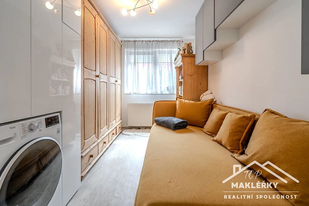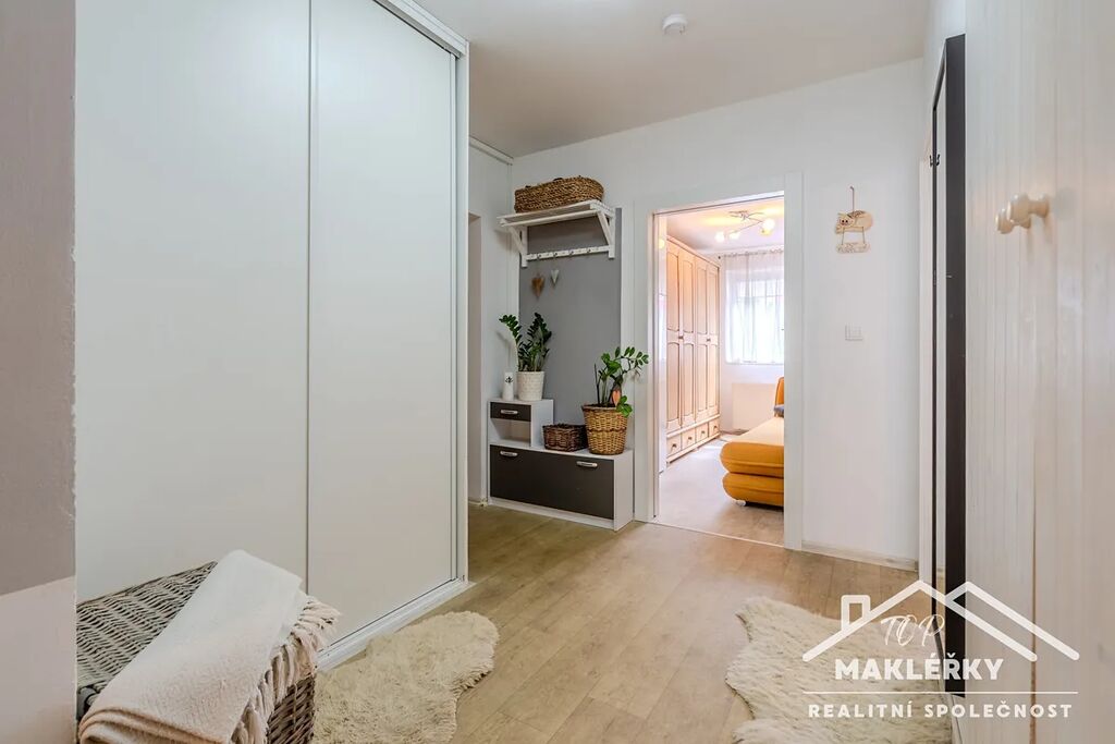 Jednotka je umístěna v přízemí bytového domu. Z centrální chodby je přímý vstup do všech místností. Rovně od vchodových dveří se nachází obývací pokoj a kuchyňský kout se zavěšenou digestoří a veškerými spotřebiči. Zde je nově položená podlahová krytina. Vlevo od vchodu je pak dětský pokoj s vestavnou skříní umístěnou v přední části pokoje.