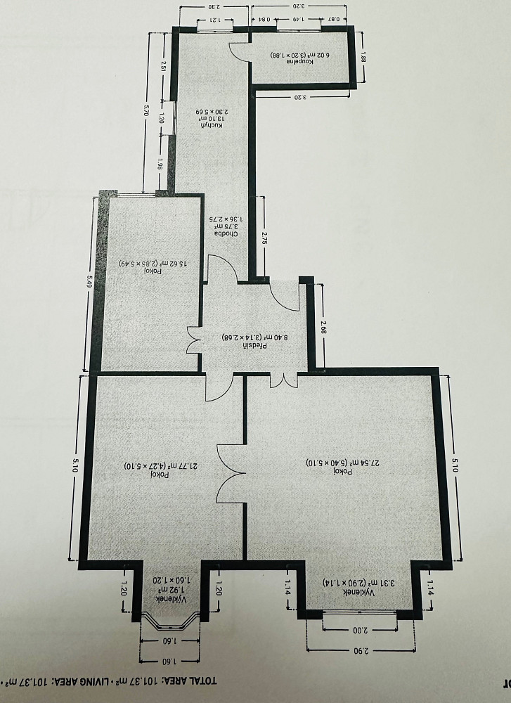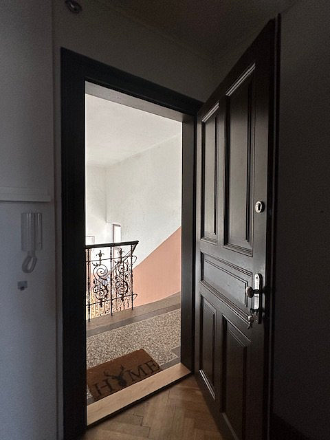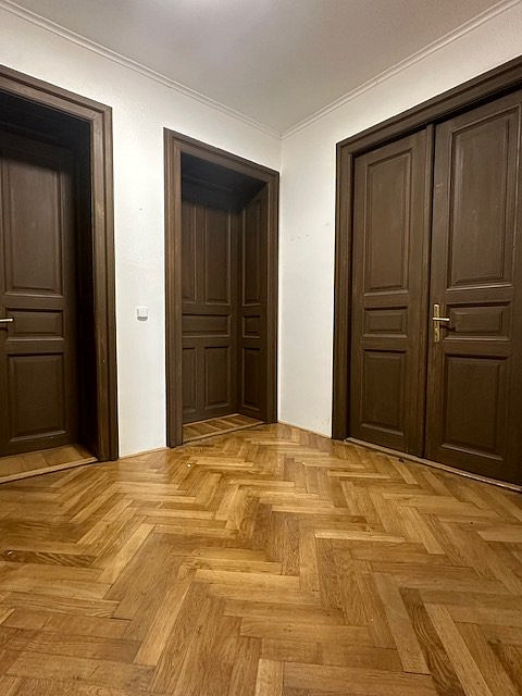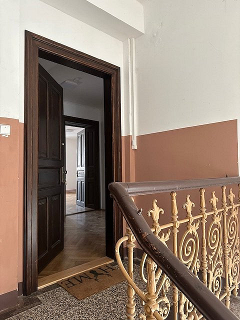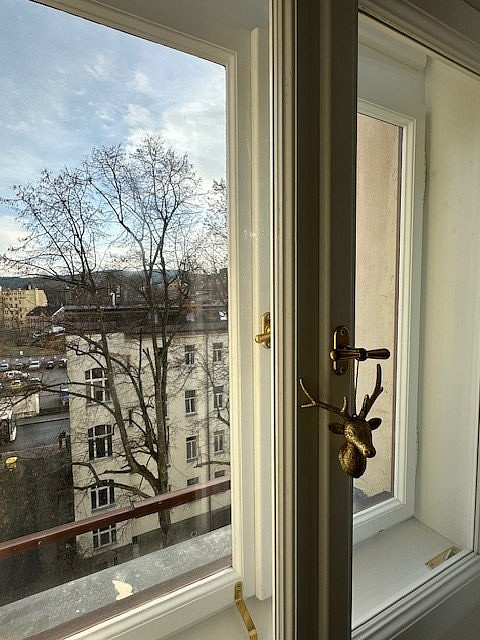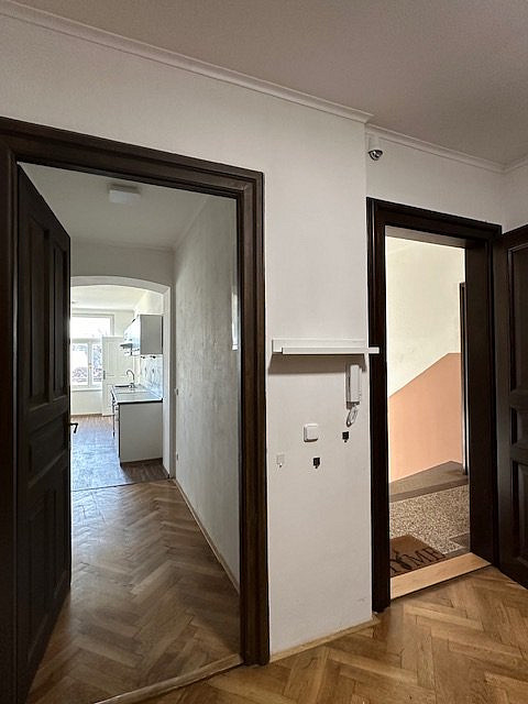 Dominantou bytu jsou veliké pokoje s okenními výklenky (28 m², 22 m², 16 m²), samostatná kuchyň (17 m²) a zcela jistě původní dvoukřídlé dřevěné dveře, historická krbová kamna a dřevěné parkety - dobrý stav, nová špaletová okna. Byt je vybaven vkusnou kuchyňskou linkou, vlastní plynový kotel, svítidla, neprůchozí pokoje - vše v nové čistě bílé výmalbě. Orientace bytu: jihozápad - jihovýchod, dům je bez výtahu / 66 schodů.