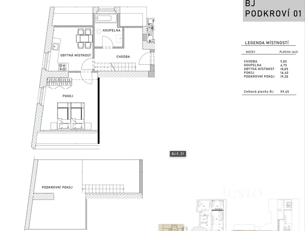 • Mezonetový prostor o velikosti 19 m² – ideální jako ložnice, pracovna nebo ateliér