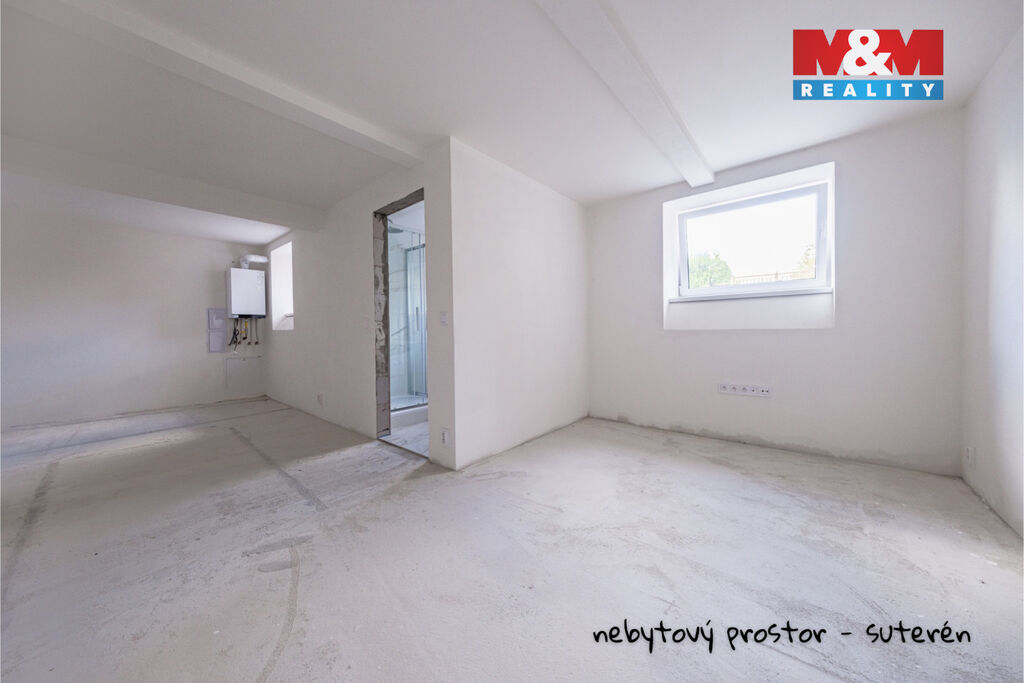 Součástí je také nebytový prostor (36 m²) vhodný pro kancelář nebo ateliér, samostatná garáž a 5 venkovních parkovacích stání. Pozemek je oplocený a nabízí zahradu k úpravě dle představ nového majitele.