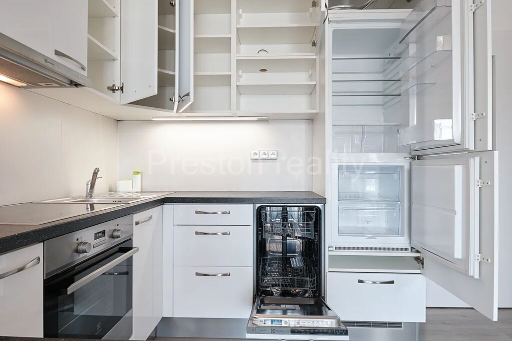 Byt se skládá z jedné místnosti - obývacího pokoje s plně vybavenou kuchyňskou linkou (22 m2). Linka je vybavena myčkou, velkou lednicí s mrazákem, sklokeramickou deskou a elektrickou troubou. Obývací pokoj je pronajímán s vybavením tak, jak je zobrazeno ve fotodokumentaci, k dispozici je rozkládací gauč, stolem, šatní skříň (šířka 180 cm) a komoda. U kuchyňské linky je instalováno posezení se dvěma židlemi. Z obývacího pokoje je přístup na balkón, který skýtá hezké výhledy do moderního areálu a okolí. Byt má slunnou západní orientaci. Koupelna je společná s WC a je v ní umístěná pračka. V chodbě se nachází za vstupními dveřmi botník s věšáky a skříňkou.