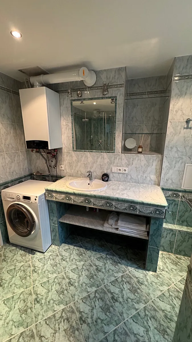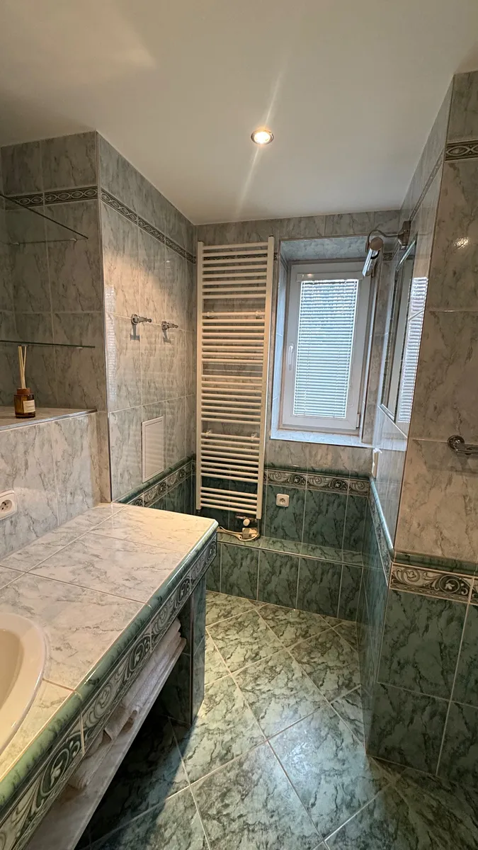 Kompletně vybavená koupelna s moderním sprchovým koutem, automatickou pračkou a dvěma žebříky na sušení ručníků. Vše v perfektním stavu.