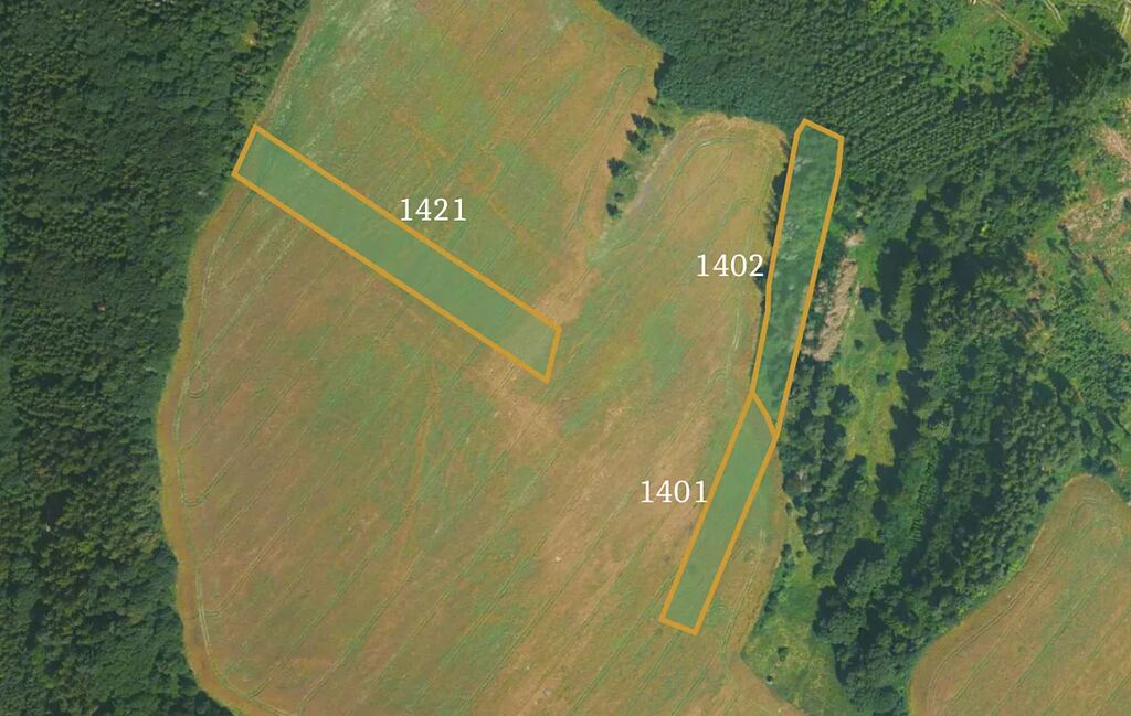 Mají celkovou výměru 12 039 m² a zapsány jsou na LV 112 pod parcelními čísly 1401, 1402 a 1421. Parcela č. 1402 je vedena jako lesní pozemek o výměře 3 803 m², u zbylých jde o ornou půdu o společné výměře 8 236 m².