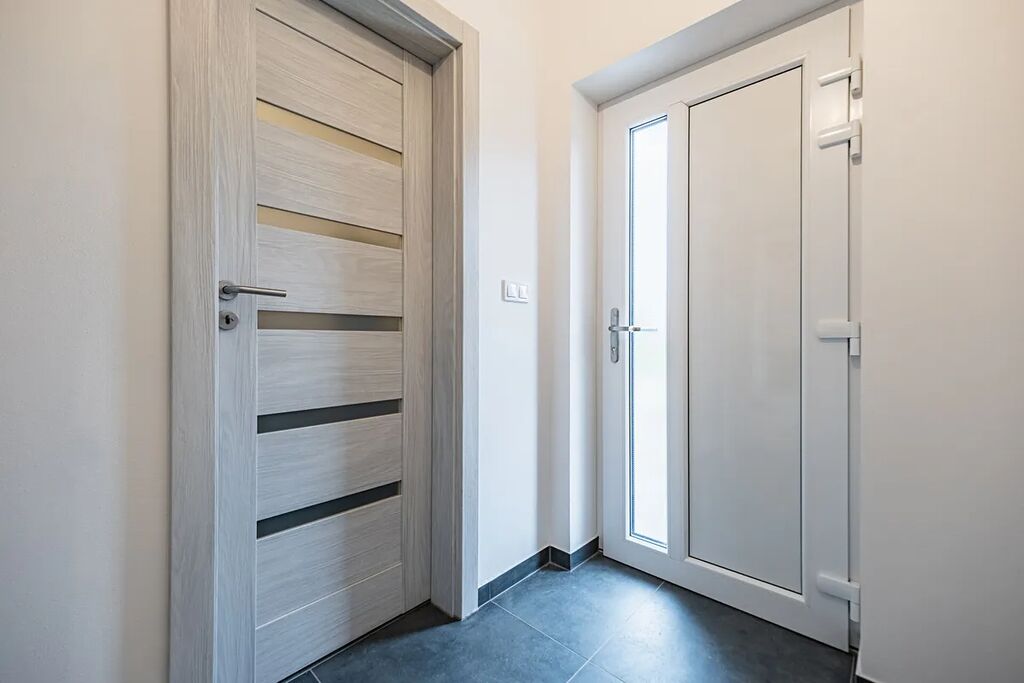 Dům nabízí také podlahové vytápění napojené na tepelné čerpadlo, plastová okna s trojskly a jednotný, příjemný design v tónu světlého dubu.