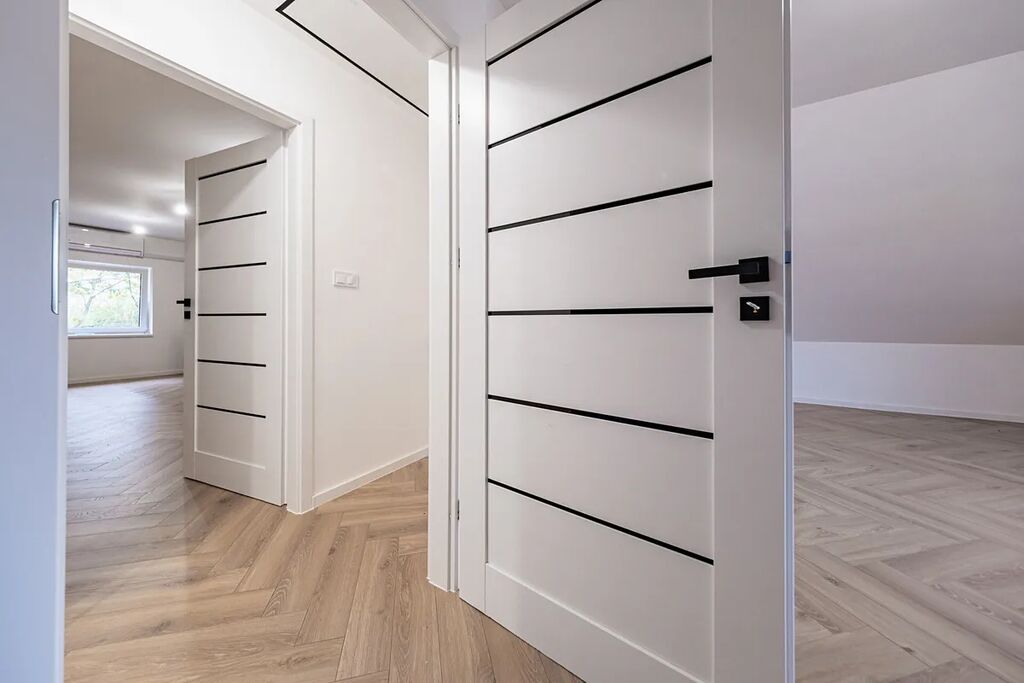 Už při vstupu vás přivítá prostorná předsíň s technickou místností, odkud se otevírá průchod do velkolepého obývacího pokoje. Dominantou je mramorový krb doplněný dřevěnými lamelami, které ladí s elegantními podlahami ve vzoru rybí kosti. Otevřený prostor propojuje moderní kuchyň s jídelnou a navazuje na venkovní terasu.