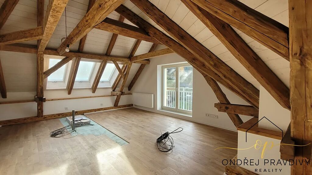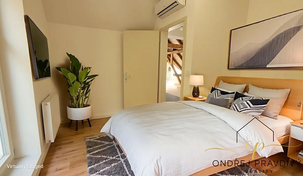 Byt se nachází v posledním 3. nadzemním podlaží a po kompletní přestavbě se může pyšnit nadstandardní kvalitou provedení a použitých materiálů. Provedení zahrnuje dřevěné plovoucí podlahy, dřevěná euro okna s trojskly, designové dlažby a nadčasové obklady. Značková sanita firem Laufen a Hansgrohe. Dále jsou datové rozvody, příprava na zabezpečení a elektromobilitu. Díky zateplení celého domu i vlastnímu kondenzačnímu kotli pro vytápění a ohřev vody budou provozní náklady skutečně příznivé. Převažující orientace na jiho-západ zajišťuje dostatek slunečního světla a stropy s přiznaným trámovím zase útulný pocit s puncem historie. Příslušenství bytu zahrnuje do zeleně orientovaný balkón, vlastní parkovací stání a prostorný sklep 11 m² na jakékoliv sportovní či sezónní vybavení. Další úložné prostory jsou v půdě nad bytem.