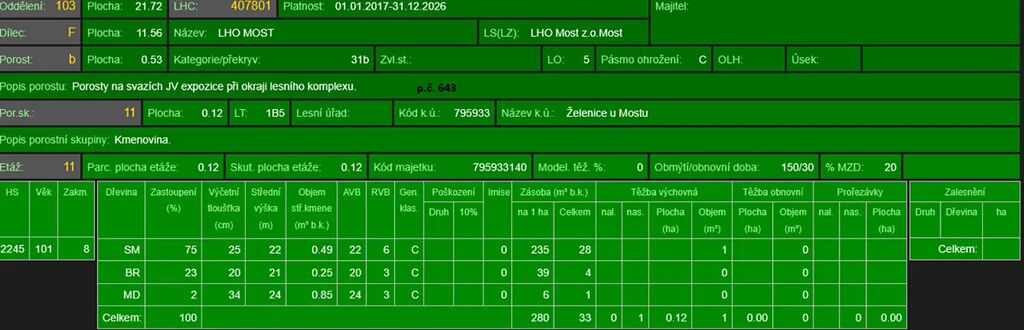 - p.č. 643 vedená jako lesní pozemek o celkové výměře 1 160 m2 (stáří lesa 109 let- zastoupení dřevin smrk, bříza, modřín)