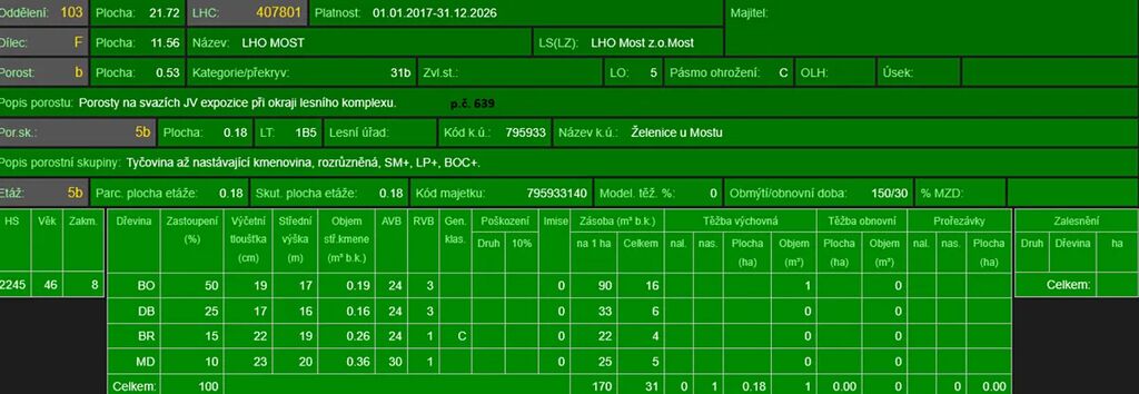 - p.č. 661 vedená jako lesní pozemek o celkové výměře 799 m2 (stáří lesa 71 let- zastoupení dřevin bříza, dub)