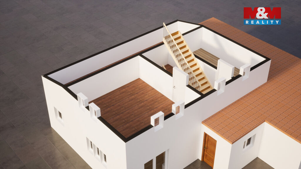 V patře jsou dva pokoje připraveny pro realizaci vašich snů, plus je zde prostorná místnost, která je v současné době nepřístupná. Půda nabízí další možnosti rozšíření obytného prostoru. Vytápění zajištuje plynový kotel.