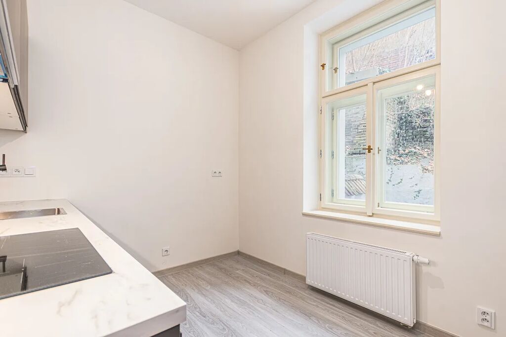 Při vstupu Vás přivítá chodba s přímým vstupem do koupelny, kde je k dispozici pračka se sušičkou. Dále se dostanete do kuchyňské části s nově zařízenou kuchyňskou linkou a vestavěnými spotřebiči: myčkou, lednicí s mrazákem, troubou a indukční varnou deskou.