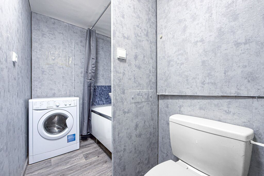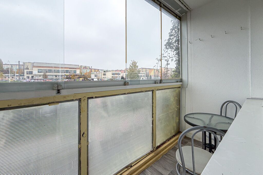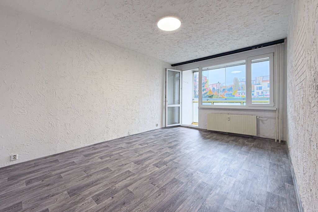 Vstupní předsíň s praktickou zděnou šatnou, koupelna s toaletou (původní umakartové jádro upravené tapetou), kuchyně ve tvaru L a obývací pokoj se vstupem na zasklenou lodžii.
