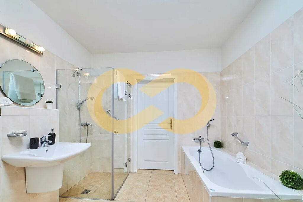Byt dále nabízí dvě ložnice, z nichž jedna disponuje vlastní šatnou, dále koupelnu s vanou, sprchovým koutem, WC a bidetem a další samostatnou toaletu. Na koupelnu navazuje úklidová komora s přípravou pro pračku, sušičku či případné domácí wellness nebo saunu.