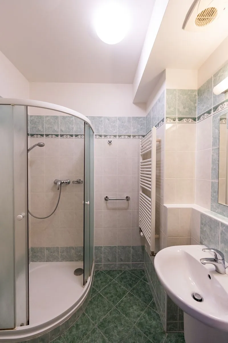 Byt je zařízený kuchyňskou linkou se sklokeramickou varnou deskou, horkovzdušnou troubou a lednicí, koupelna se sprchovým koutem a WC, v předsíni vestavěná šatní skříň.