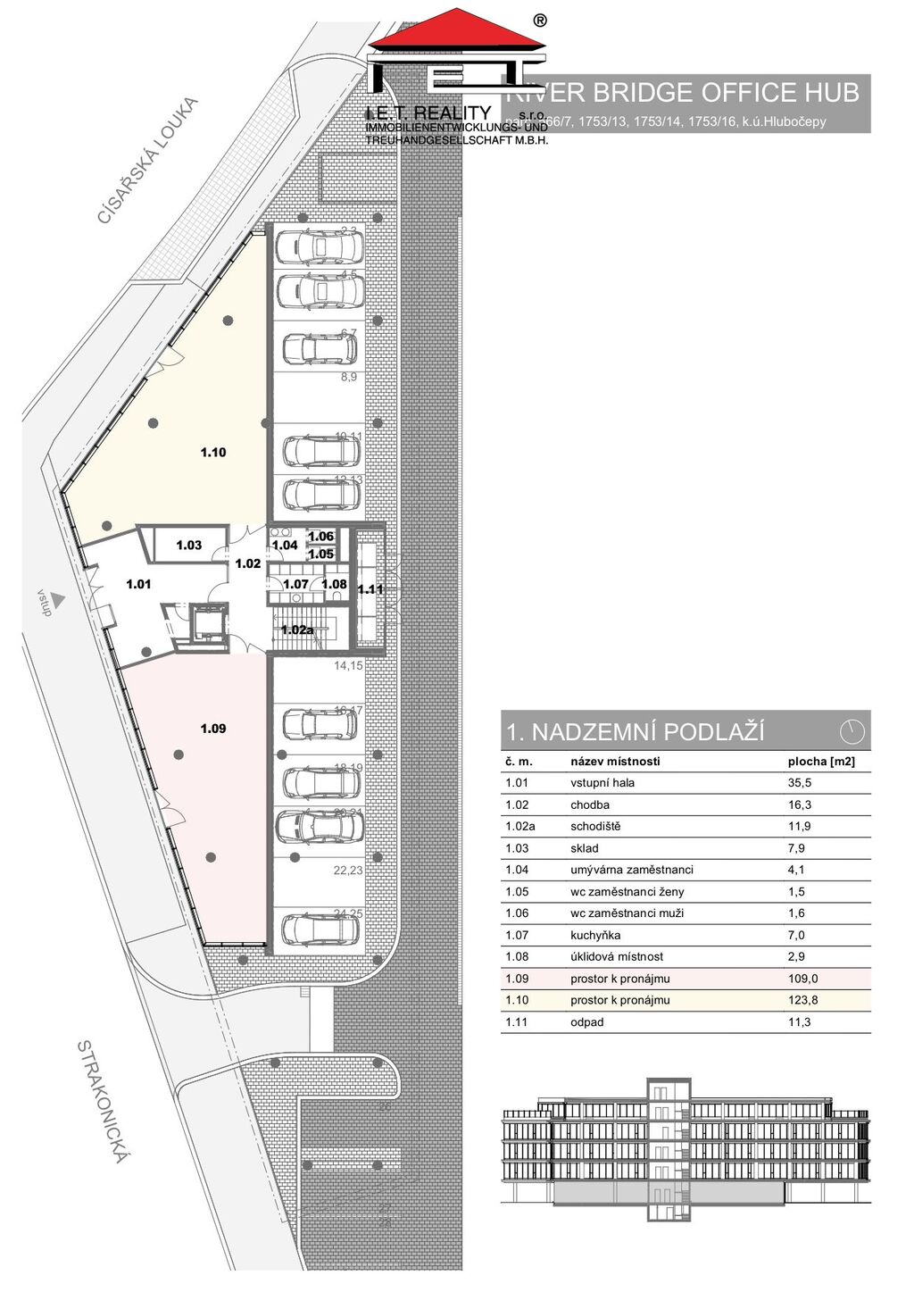 Prostory č. 1.09 o celkové výměře 109 m2 se nachází v přízemí administrativní budovy na břehu řeky Vltavy, která se stane součástí areálu River Business Centre. Je možné k nim využívat sociální zázemí o velikosti 66 m2, které se nachází na patře. Služby spojené s užíváním prostorů jsou stanovené na cenu 140 Kč za m2 plochy pronájmu.