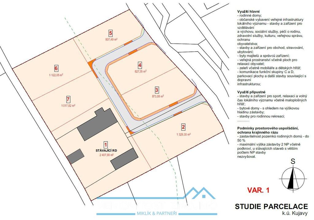 a.) zachování stávajícího rodinného domu + další rozdělení na 6 stavebních parcel o výměře 807-1329m2