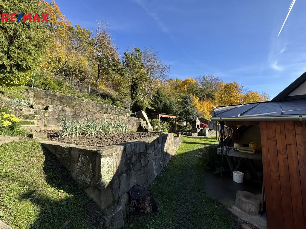● terasovitá zahrada se skleníkem a políčky pro pěstování
