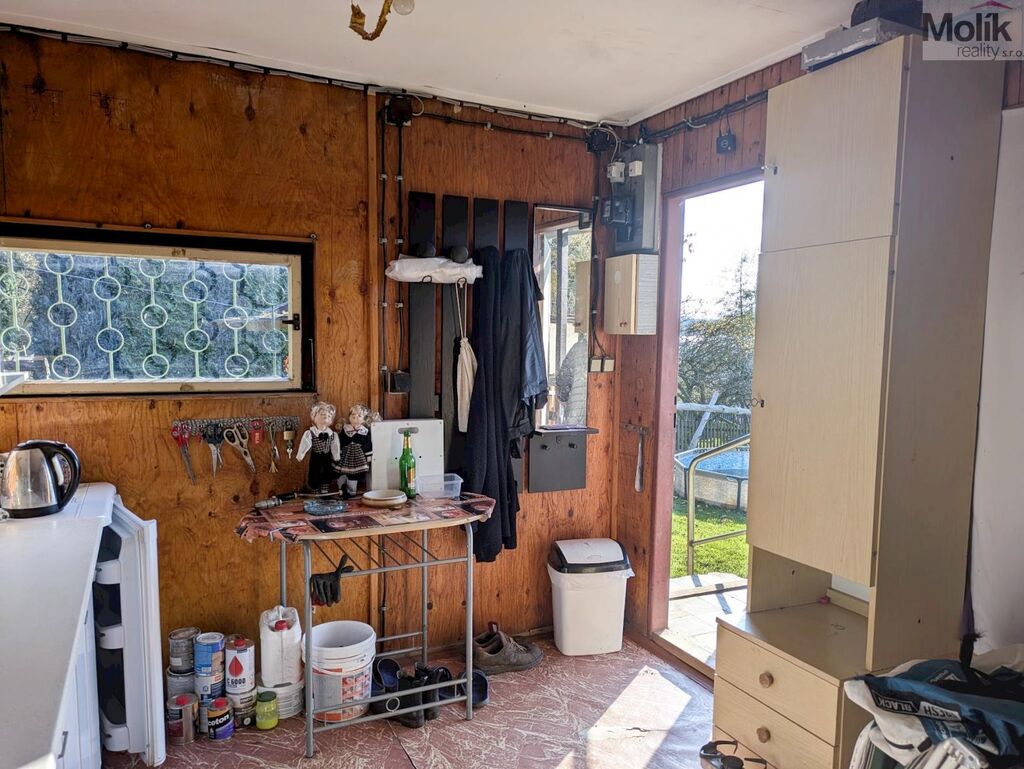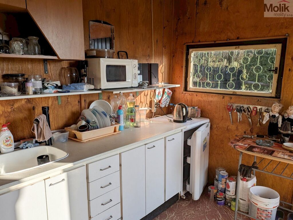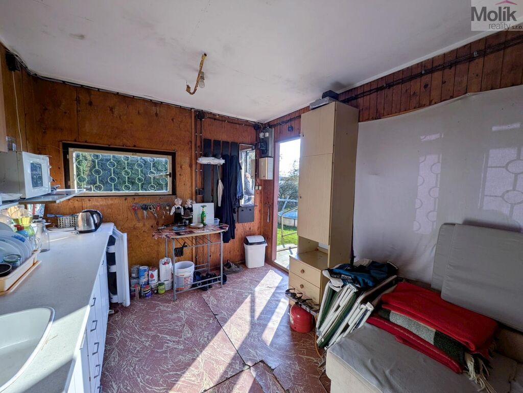 Chata stojí místě s hezkým výhledem a přímo za ní se rozprostírá les, do kterého je vstup ze zadní části zahrady. Díky menší kolonii zde najdete klid, soukromí i nezaměnitelnou atmosféru. Zahrada je udržovaná, lehce svažitá a na pozemku se nachází bazén, jabloně a pergola s posezením - ideální místo pro večery s rodinou či přáteli. (Nábytek v pergole i téměř nový plynový gril jsou součástí kupní ceny.) Příjezdová cesta je částečně zpevněná, vysypaná kamínky.