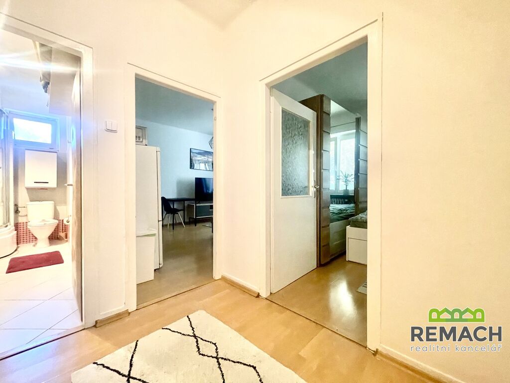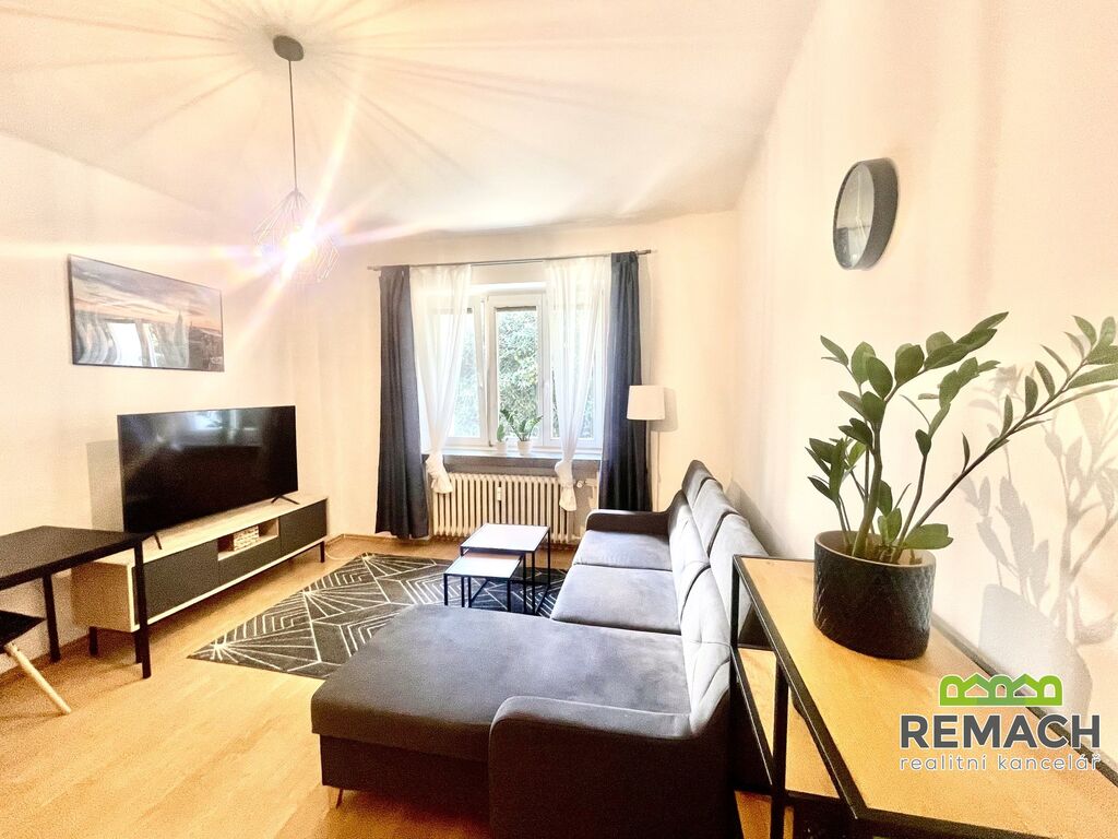 Byt je částečně zařízený a jeho dispozice nabízí prostorný obývací pokoj s kuchyňským koutem, samostatnou ložnici a moderní koupelnu se sociálním zařízením. Pokoje jsou neprůchozí, což zaručuje dostatek soukromí. Součástí pronájmu je také sklepní prostor.