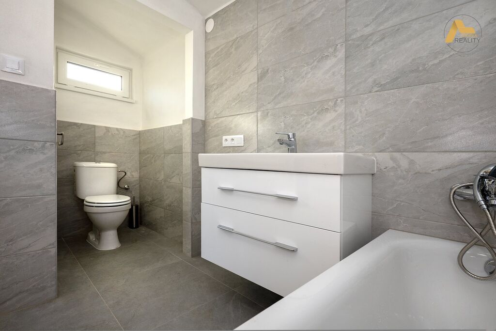 Koupelna s toaletou je pojata v moderním stylu, disponuje oknem, prostornou vanou a místem pro pračku. K bytu dále náleží balkon a úklidová komora.