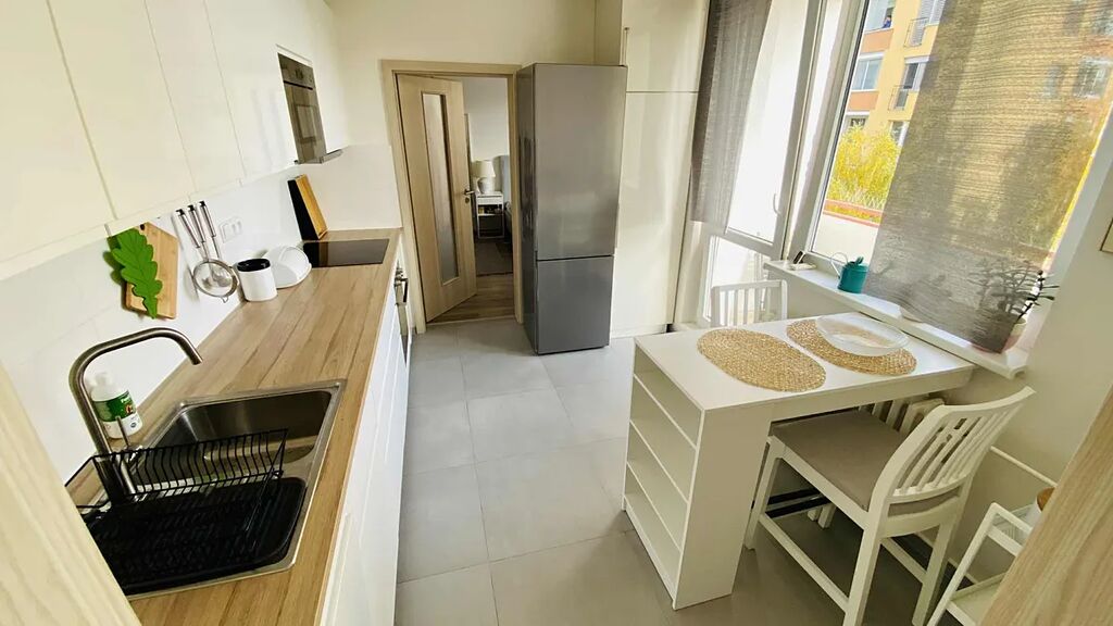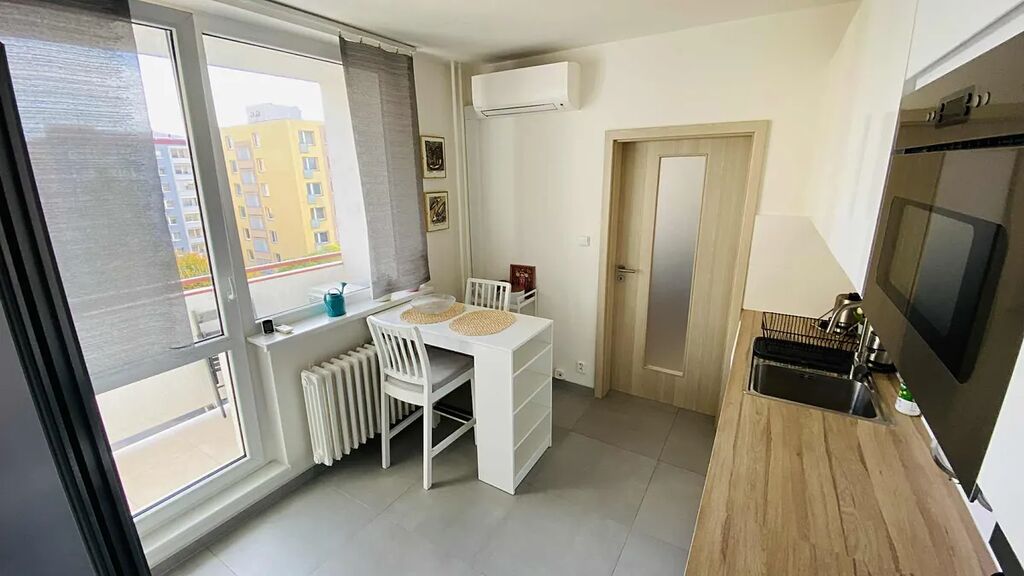 V celém bytě jsou komplet nové plovoucí podlahy, nové vnitřní obložkové zárubně a dveře, vyspravené omítky, komplet nový rozvod elektřiny, vody a odpady, klimatizace je umístěná v kuchyni a bez problému vychladí sousední ložnici a obývací pokoj.