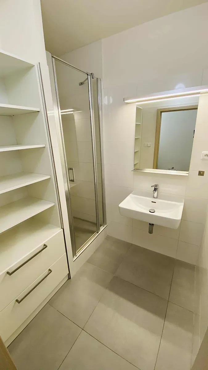 Koupelna je nyní s velkým sprchovým koutem, umyvadlem a vestavěnou policovou skříní. WC je samostatné s umyvadlem a místem pro pračku a sušičku.