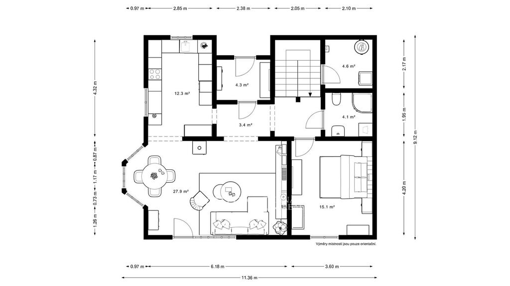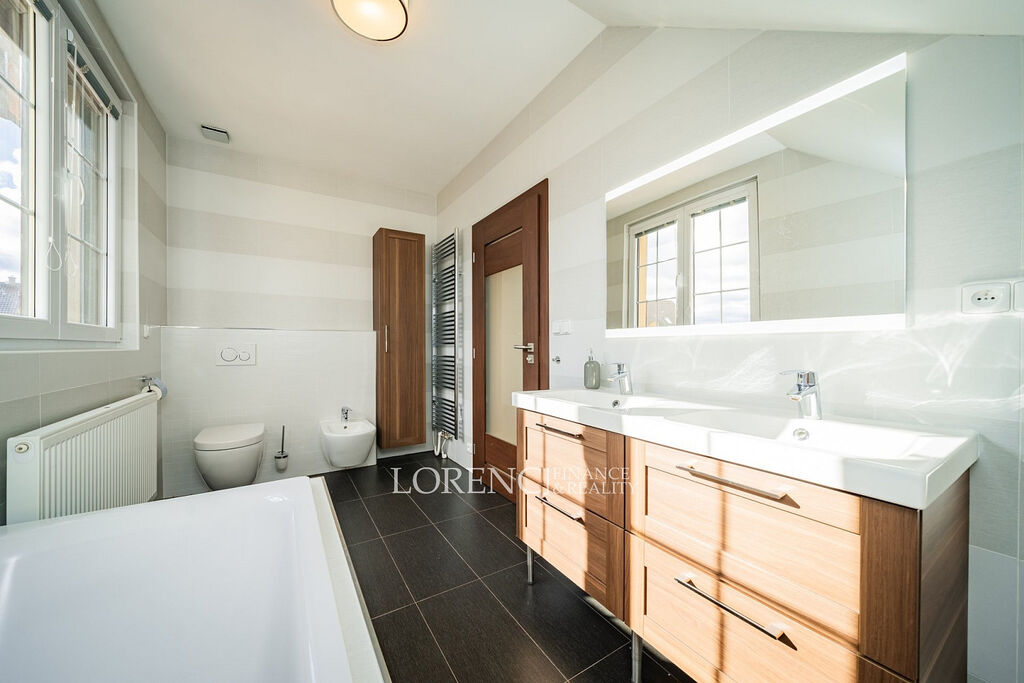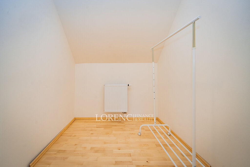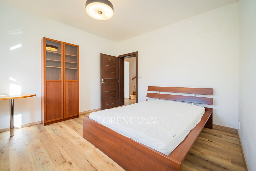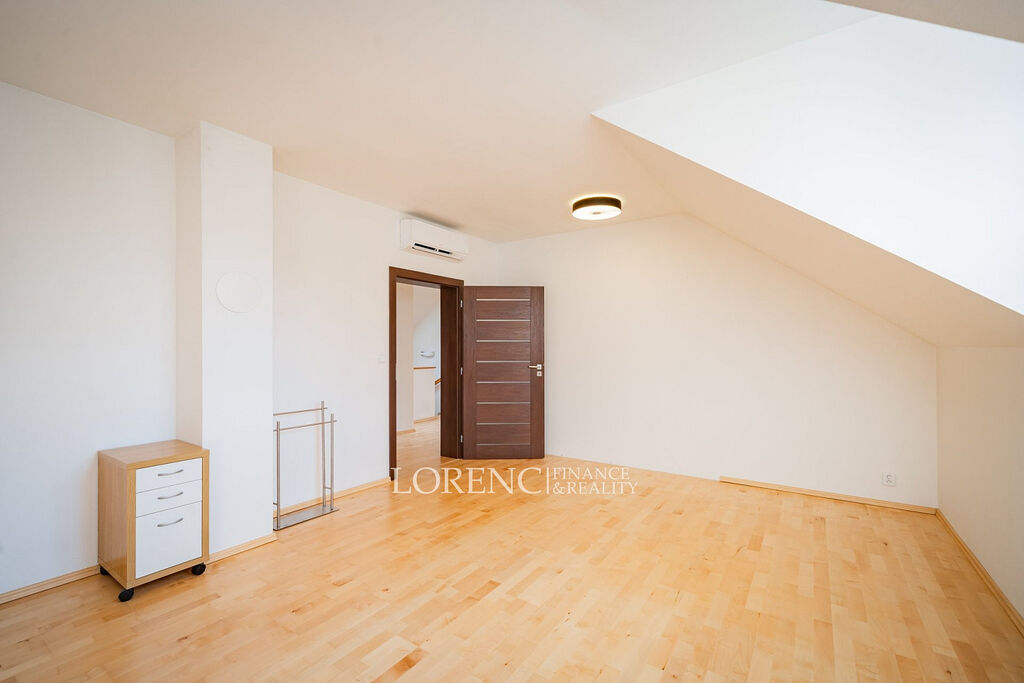 Do horního patra vedou schody k třem prostorným pokojům (18, 23 a 14 m²), koupelně (9 m²) a praktické šatně (5 m²). Podlahy v patře jsou kompletně dřevěné, což vytváří útulnou a příjemnou atmosféru. Všechna okna jsou vybavena předokenními roletami.