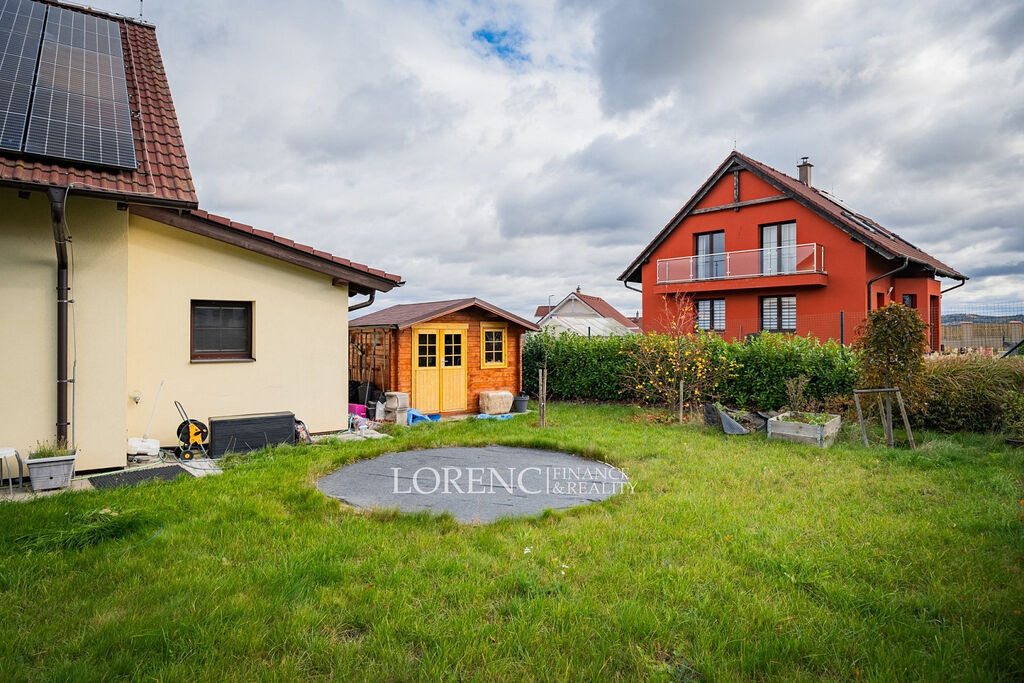Okolí domu tvoří krásná zahrada, ve které je připravena instalace zavlažovacího systému napojeného na nádrž na dešťovou vodu (6 m³). S dostatkem prostoru pro děti, hry i odpočinek představuje zahrada ideální místo pro trávení volného času. Součástí zahrady je také domek na nářadí.