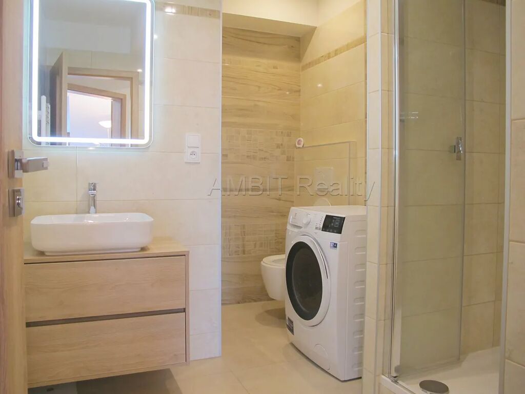 Byt sestává z menšího pokoje s kuchyňským koutem (kuchyň, nebo menší obývák) a druhého většího pokoje (ložnice, nebo větší obývák), dále byt sestává z koupelny s WC, předsíně a úložné komory v půdní vestavbě. Byt se prodává nezařízený, k dispozici zůstane vybavená kuchyňská linka a šatní skříně v ložnici. Kuchyňský kout je vybavený moderní kuchyňskou linkou se spotřebiči (sklokeramická indukční varná deska, elektrická pečicí trouba, samostatně stojící lednice s mrazákem). Z jednoho pokoje je výhled do klidného zeleného vnitrobloku a z druhého do dálky na celou Prahu. V koupelně se nachází umyvadlo, zděný prostorný sprchový kout, WC a přípojka na pračku. V koupelně a předsíni je podlahové topení.