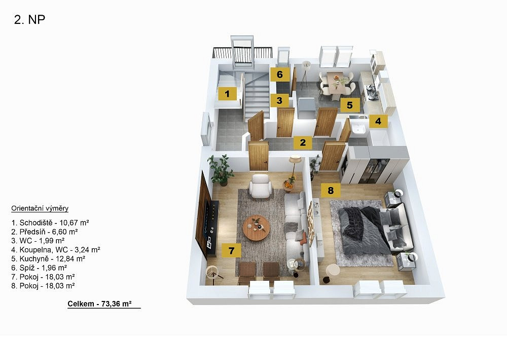 Dům nabízí celkovou obytnou plochu přibližně 168 m², rozloženou do dvou plnohodnotných podlaží a obytného podkroví.