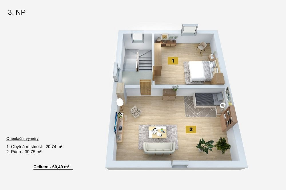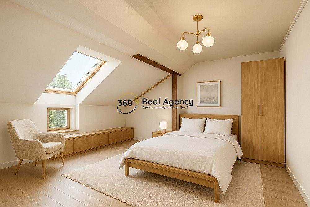 Pod střechou navíc najdete další půdní prostor cca 40 m², který lze přestavět na samostatnou jednotku, ateliér či relaxační zónu.