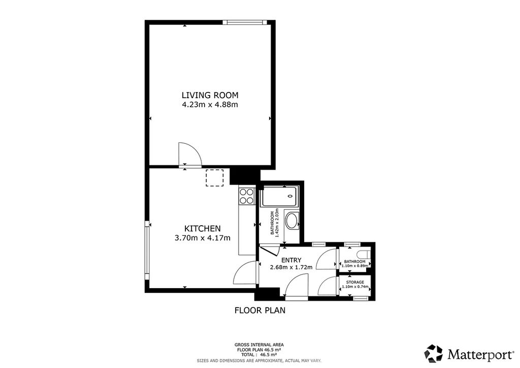 Byt tvoří obývací pokoj s kuchyňským koutem, samostatná ložnice, koupelna se sprchovým koutem, samostatné WC a praktická komora, která nahrazuje sklepní prostor – velmi pohodlné řešení pro každodenní použití.