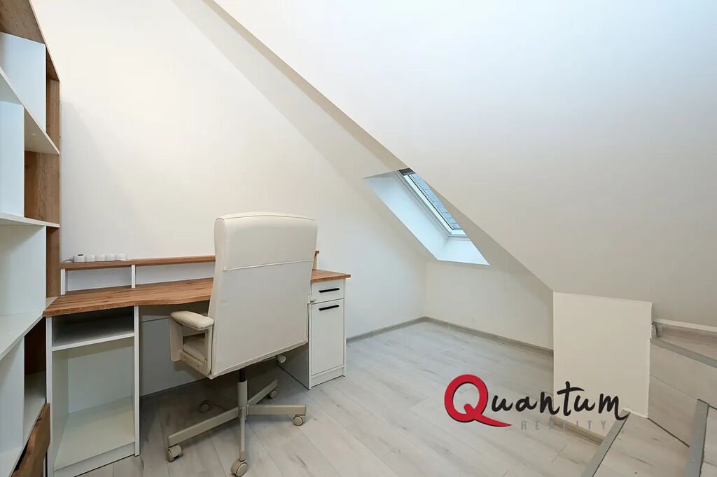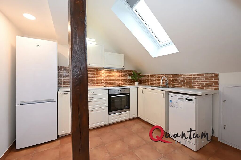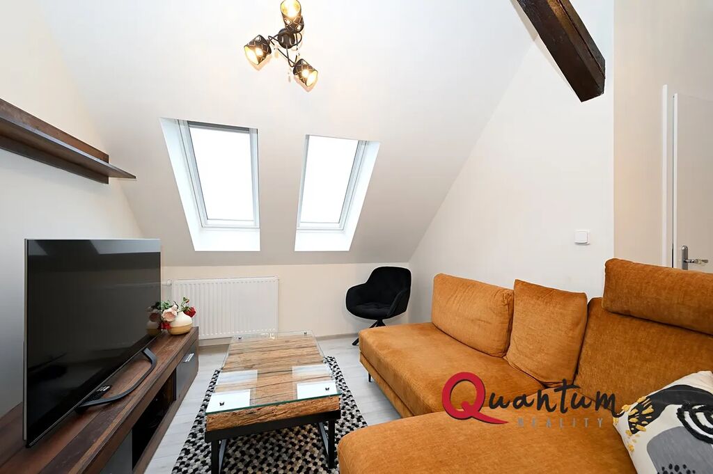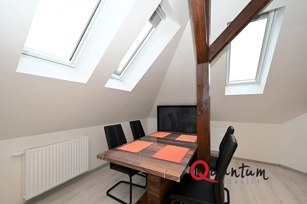 Střešní okna: Celý byt je prosvětlen díky střešním oknům, která dodávají prostoru vzdušnost a příjemnou atmosféru.