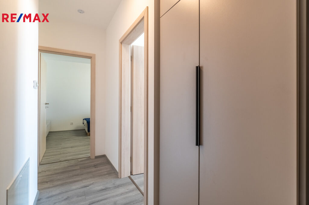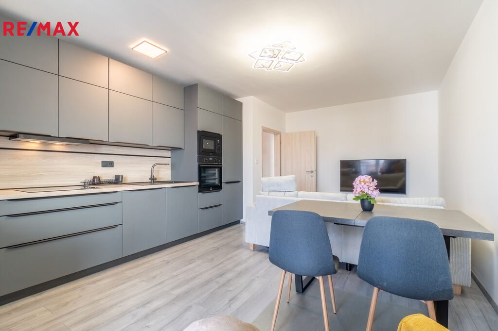 V obývacím pokoji s kuchyňským koutem je vstup na prostorný balkon, ideální pro ranní kávu. Obývací část je zařízena rozkládací sedačkou a jídelním stolem se židlemi. Kuchyňská linka je vybavena vestavěnými spotřebiči: varná deska, myčka, lednice, trouba, mikrovlnná trouba a digestoř. Na stejné straně se nachází dětský pokoj či pracovna s flexibilním využitím, vybavená pracovním stolem. Dále je k dispozici ložnice s manželskou postelí a vestavěnou skříní.