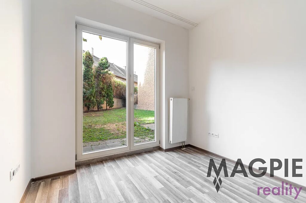 Dispozičně je byt řešen velmi prakticky. Vstupní část tvoří zádveří o velikosti 5,6 m², kde je místo pro vestavěné skříně. Ze zádveří je přístup do koupelny s toaletou (4,02 m²) a do obou obytných místností. Obývací pokoj o ploše 16,26 m² je vybaven kuchyňskou linkou se spotřebiči a díky velkým francouzským oknům umožňuje přímý vstup na zahradu. Ložnice (11,8 m²) má rovněž francouzská okna a také vstup na zahradu. Zahrada o rozloze 85 m² představuje významnou přednost bytu – poskytuje dostatek prostoru pro děti, zvířata, zahradničení i odpočinek, a díky oplocení a okolní zástavbě zajišťuje soukromí.