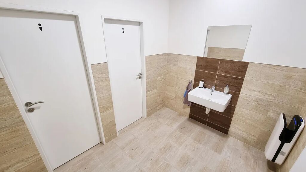 Sociální zázemí tvoří kuchyňka (8 m²) s vestavěnou kuchyňskou linkou a myčkou, toalety (10 m²) zvlášť pro muže a pro ženy a samostatná sprcha (5 m²) s umyvadlem a toaletou.