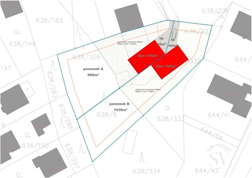 Celková plocha umožňuje rozdělení na dvě části – pozemek A o výměře 980 m² a pozemek B o výměře 1 036 m² – přičemž obě parcely splňují podmínky územního plánu.