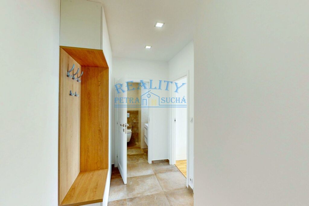 Předsíň: keramická dlažba, designová předsíňová stěna s botníkem s dotykovým otevíráním, domácí telefon.