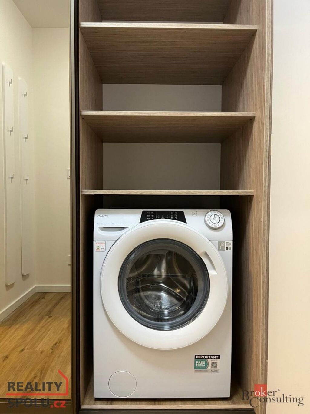 Byt je vybaven kuchyňskou linkou, která je vybavená indukční varnou deskou, horkovzdušnou troubou, myčkou, mikrovlnnou troubou a moderním černým dřezem a baterií. V ložnici a v předsíni jsou vestavěné skříně. Byt je též vybavený pračkou a na obou oknech jsou venkovní rolety. K bytu náleží venkovní parkovací stání a sklepní kóje.