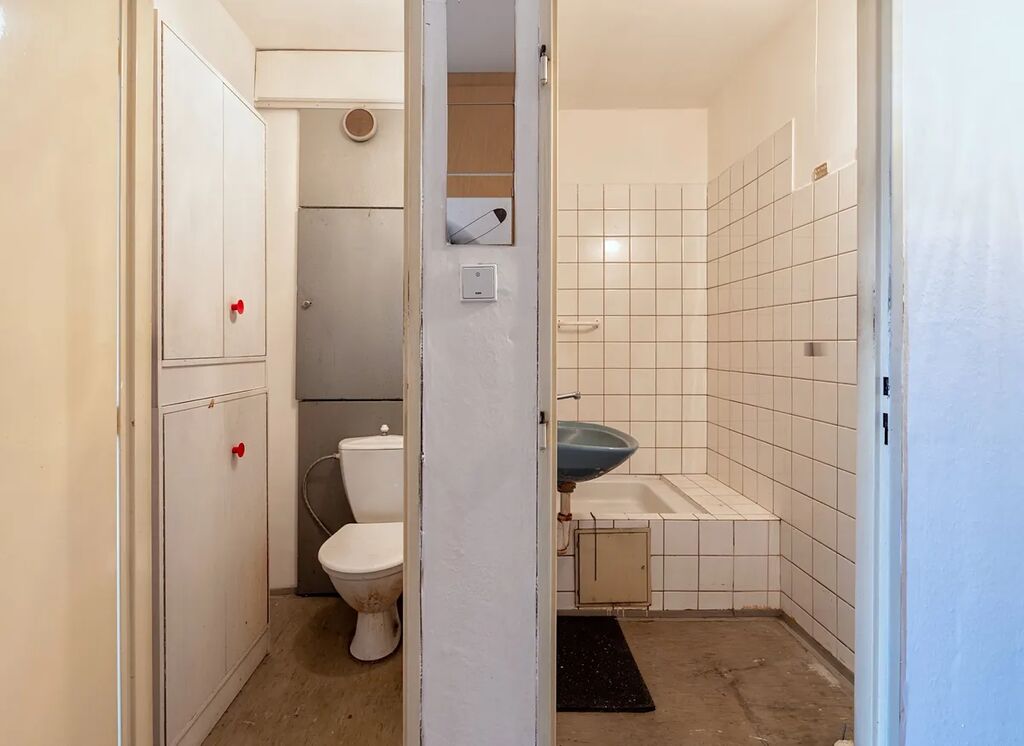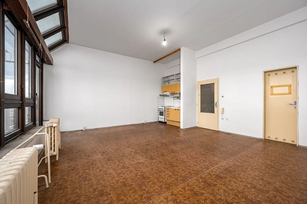 Samotný ateliér má užitnou plochu 42 m² a balkon o velikosti 4 m². Díky nadstandardní výšce stropů 3,3 metru působí interiér mimořádně vzdušně a nabízí prostor pro kreativní řešení - například vestavěné patro na spaní či knihovnu po celé výšce stěny. Jednotka je v původním stavu, což představuje ideální příležitost pro kompletní rekonstrukci přesně podle vašich představ. Můžete si tak vytvořit vlastní prostor k životu, práci nebo pronájmu. Součástí je koupelna se sprchovým koutem a umyvadlem, samostatné WC a balkon s příjemným výhledem na okolí.