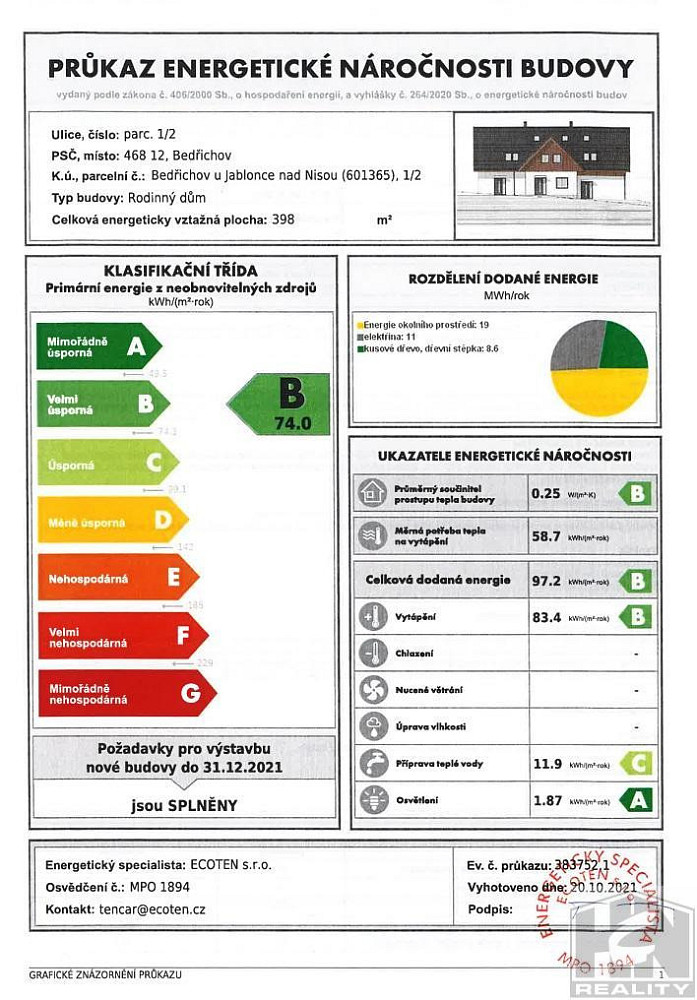 | Ukazatel energetické náročnosti | 74 kWh/m2 za rok |