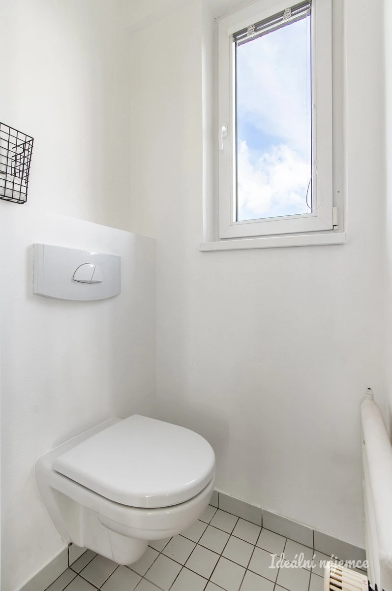 Z prostorné vstupní haly se dostáváme nejdříve do ložnice, která disponuje dostatkem uložních prostor díky vestavěné šatní skříni. Dále plně vybavenou kuchyní skrz jídelní část až do obývacího pokoje, ve kterém můžeme ponechat sedačku, taburetku a konferenční stolek. Koupelna se nabízí s pračkou, toaleta je odděleně. Součástí pronájmu je i sklepní kóje.